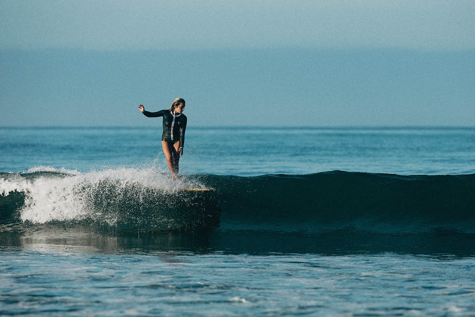 Tailored for women, the Ladies Swim Minx features a front zipper for effortless entry and contoured hip panels for enhanced comfort. Its upper body design draws inspiration from a 1920's corset, ensuring a snug fit with a stylish silhouette. This suit is essentially the Nineplus Catsuit, reimagined with a swimsuit cut in nylon, minus the legs. It boasts blind stitching on the inside and sealed smooth-skin panels on the outside, securing a watertight seal across the torso and arms. The seat panel is reinforced for added durability, whether you're perched on a surfboard or elsewhere. Crafted from Yamamoto Neoprene, the Swim Minx utilizes 2mm neoprene throughout, offering exceptional warmth by eliminating wind chill.